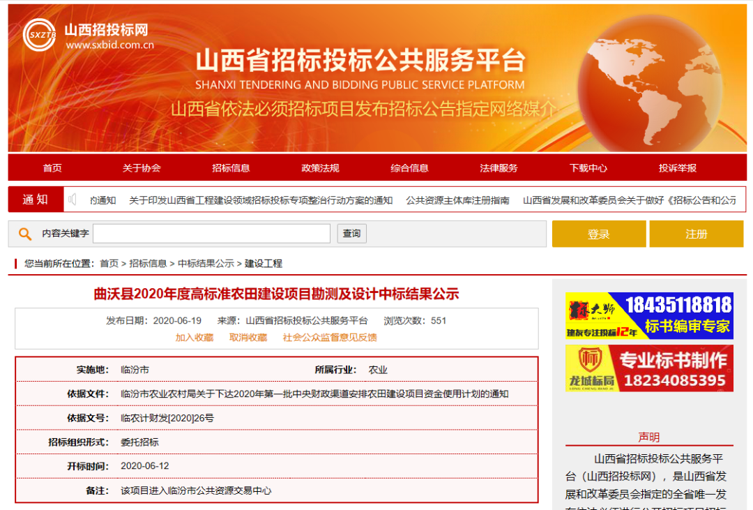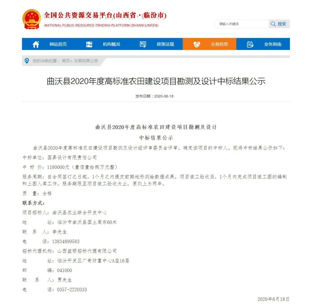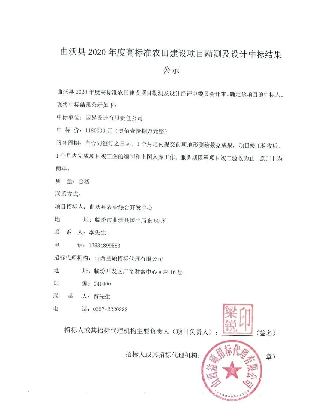 项目名称:曲沃县2020年度高标准农田建设项目勘测及设计中标结果公示