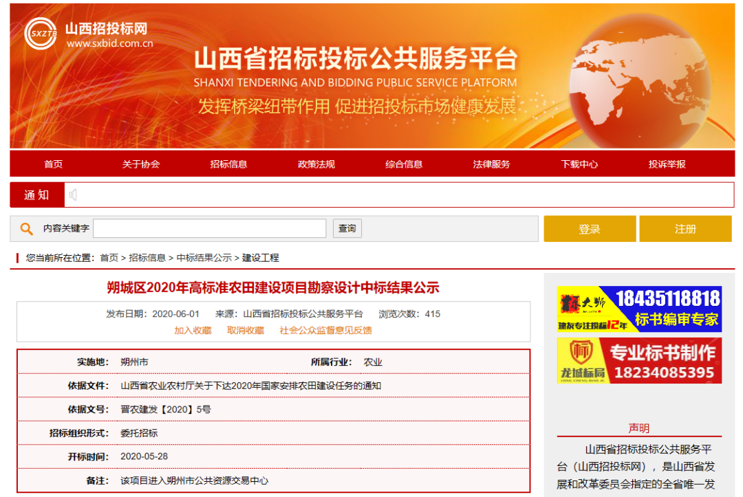 项目名称:朔城区2020年高标准农田建设项目勘察设计中标结果公示