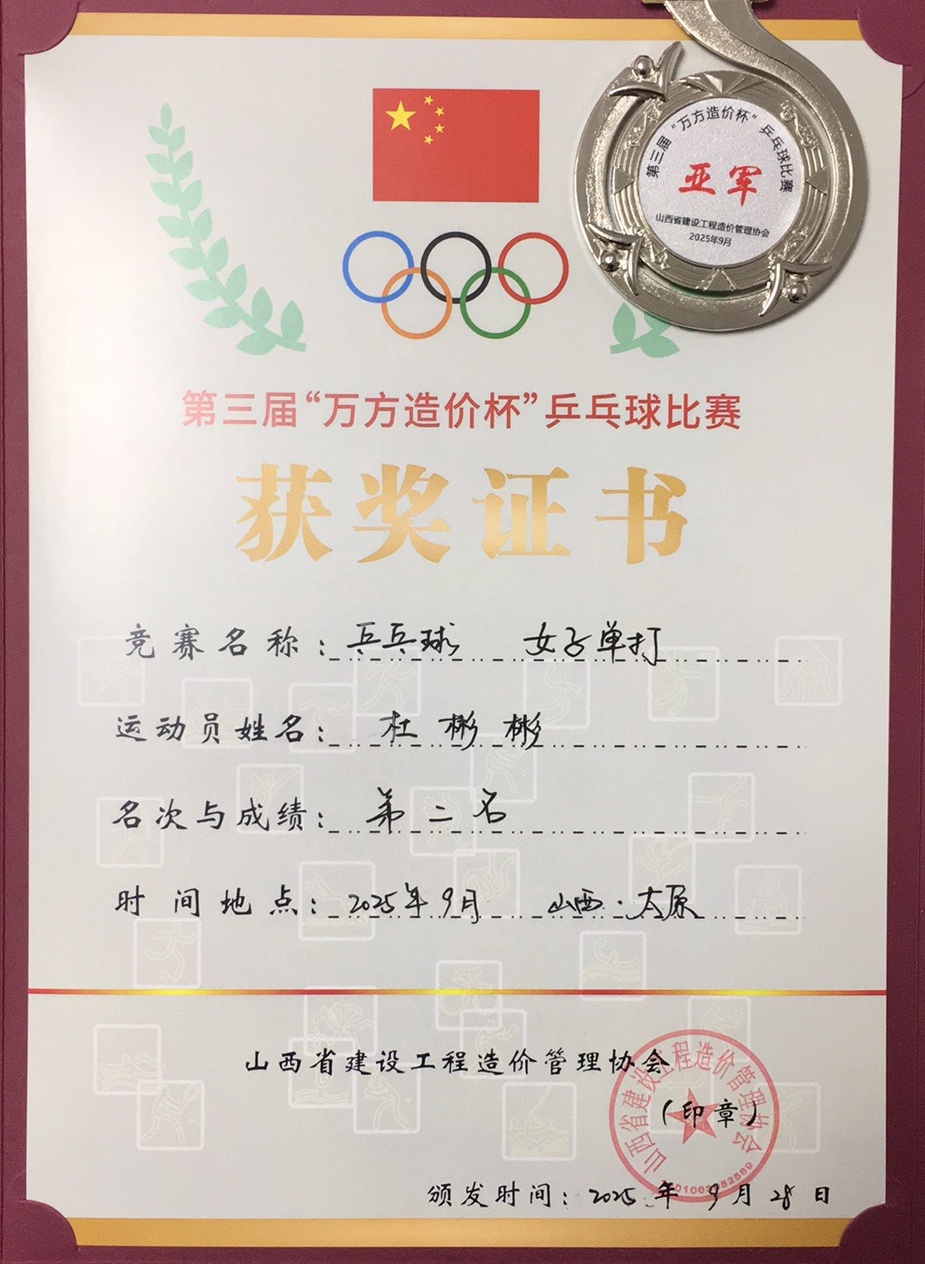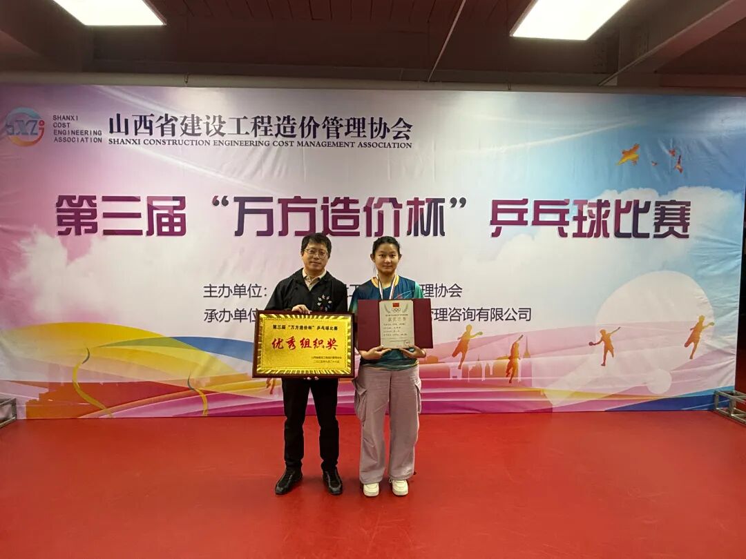 9月28日,由山西省建设工程造价管理协会主办的第三届“万方造价杯”乒乓球比赛圆满落幕。本次赛事汇聚建筑造价行业31支代表队同台竞技,经过多轮激烈角逐,我公司员工杜彬彬在女子单打项目中凭借出色发挥荣获亚军,与此同时,公司还获得优秀组织奖。